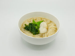 つるりとした喉ごしの「稲庭そうめん」に、ふんわりとした笹かまぼこや香り豊かなアオサ、鮮やかな絹さやが彩りと食感のアクセントを添えます。