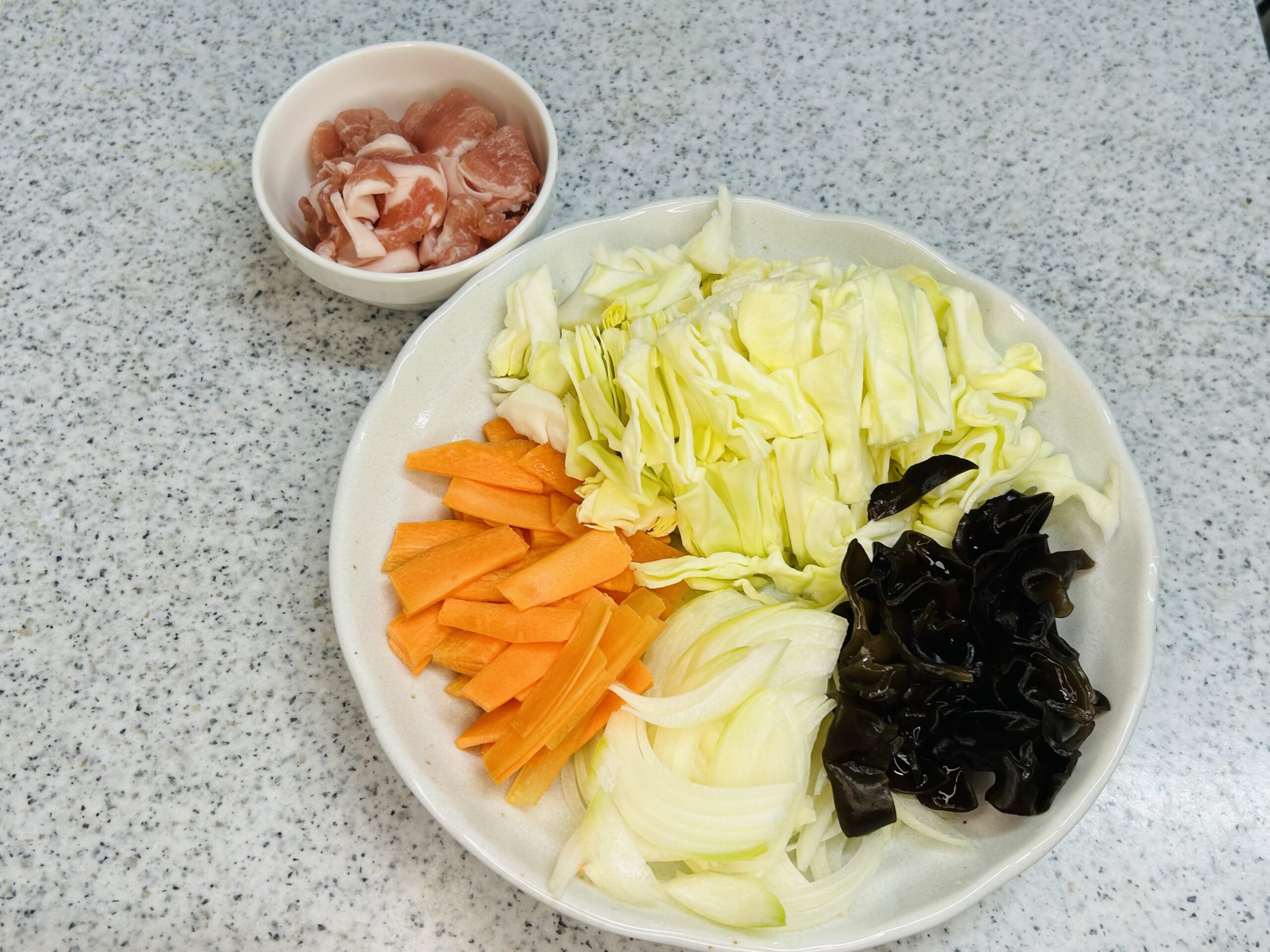 - 豚肉・生きくらげ・野菜類は食べやすい大きさに切ります。フライパンで、豚肉・生きくらげ・野菜類を炒め、水溶き片栗粉意外の【あんの材料】を加え、ひと煮立ちさせます。水溶き片栗粉を回し入れて、とろみをつけます。