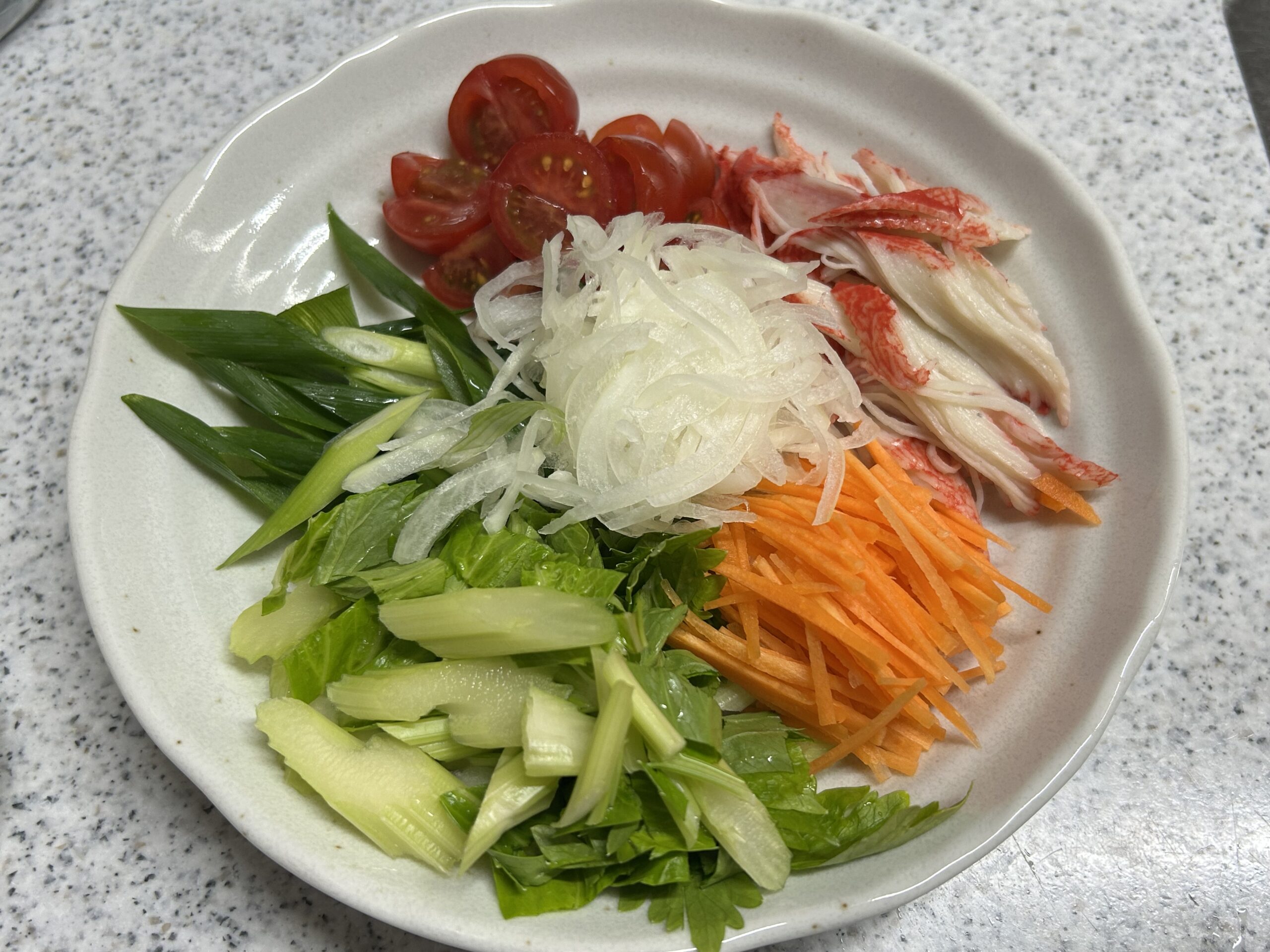 - 沸騰したお湯に塩少々を加え、豚ひき肉を茹でて、ザルにあげて冷ましておきます。この時、ゆで汁を大さじ1取り分けておきます。カニカマは食べやすい大きさに手で割き、セロリ・玉ねぎ・にんじん・ミニトマト・青ねぎは食べやすい大きさに切ります。【ドレッシング】の材料に、豚ひき肉のゆで汁を加え、合わせておきます。ボウルに氷水を準備します。