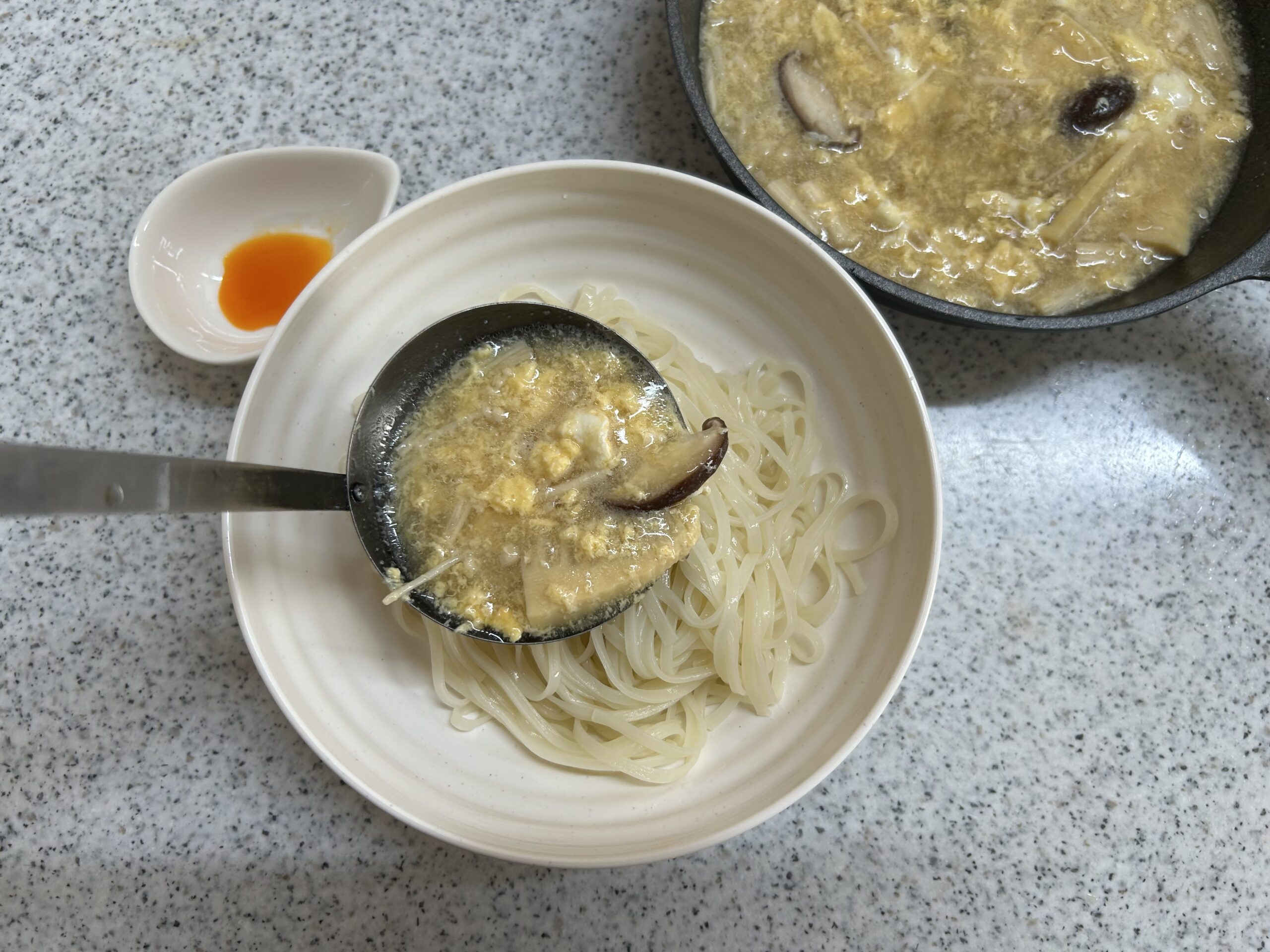 器に②のうどんを盛り付け、①のつゆを注ぎ、ラー油を回しかけて完成です。