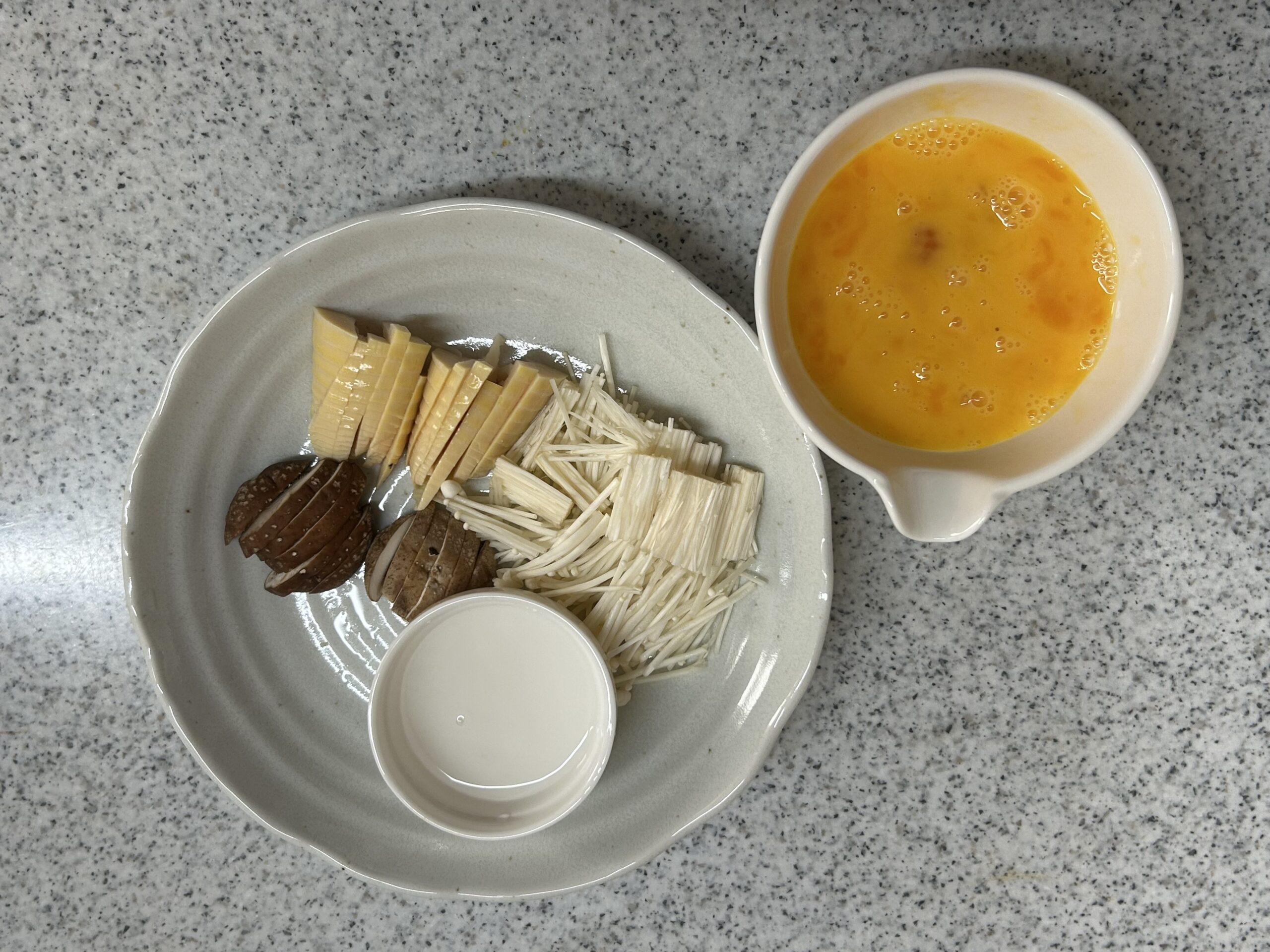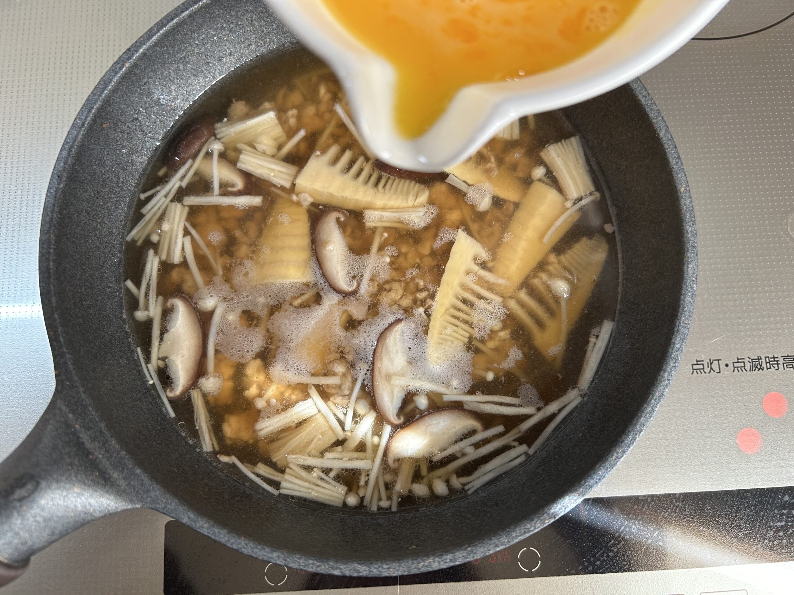 たけのこ・しいたけ・えのきだけはは食べやすい大きさに切ります。卵は割りほぐしておきます。水溶き片栗粉を作っておきます。フライパンを温め、豚挽き肉を炒め、色が変わったら、たけのこ・しいたけ・えのきだけを加え、【めんつゆ】の材料を全て入れ、煮立ちしたら、溶き卵を回し入れ、水溶き片栗粉を加えて、とろみをつけます。
