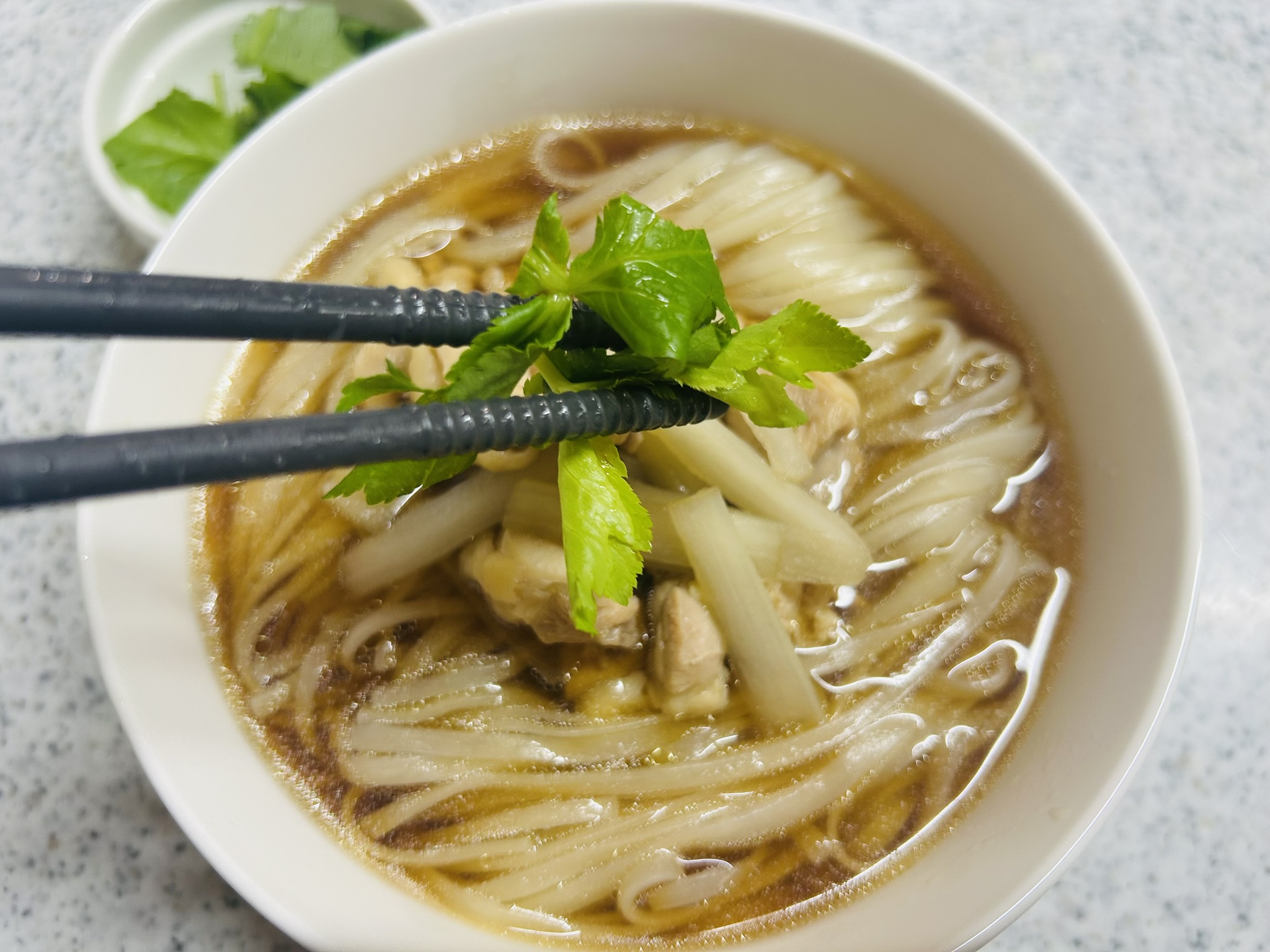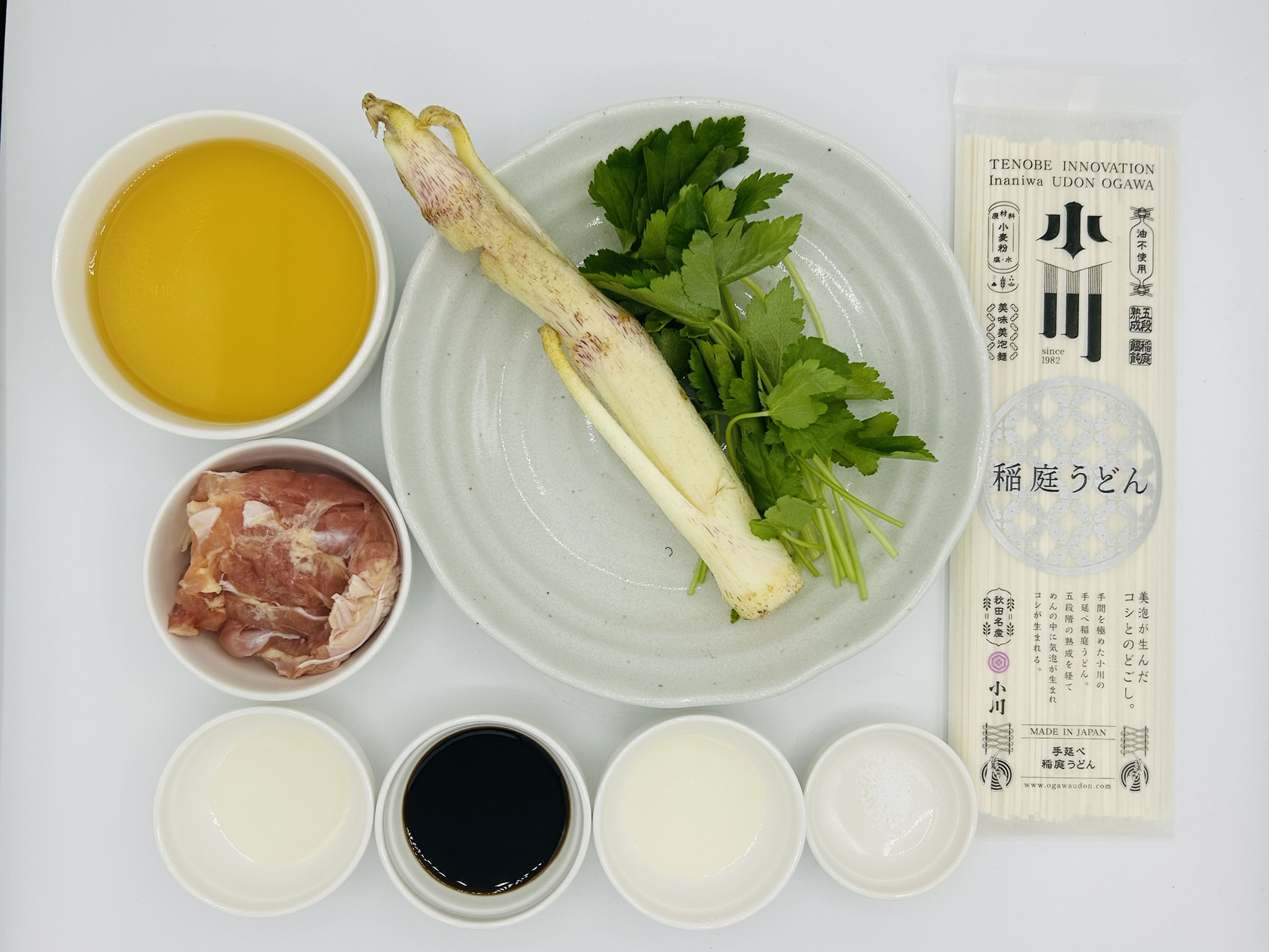 - 器に②のうどんと①のつゆを入れ、三つ葉を添えて完成です。