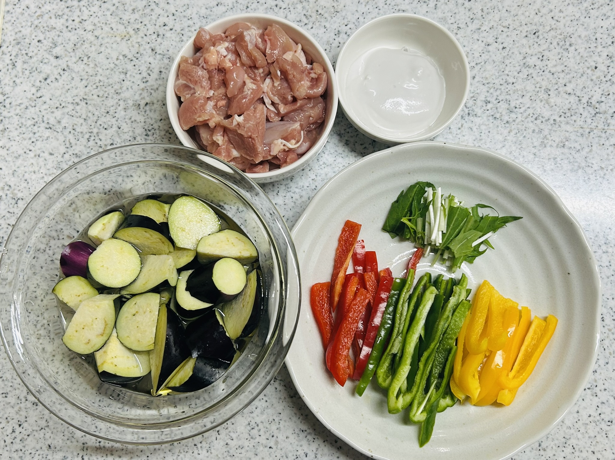 - 鶏もも肉、ピーマン、パプリカ、水菜は食べやすい大きさに切ります。なすは乱切りにして水にさらしてアクを抜きます。ココナッツミルクは、脂肪分を大さじ4程度、取り分けます。フライパンにサラダ油・グリーンカレーペーストを入れて、取り分けたココナッツミルクの脂肪分を少量ずつ加えながら炒め、香りを引き出します。香りが立ったら、残りのココナッツミルク・鶏もも肉を加えます。鶏肉に火が通ったら、ピーマン・パプリカ・水を切ったナスを加え、ひと煮立ちしたら、ナンプラー・砂糖で味を整えます。