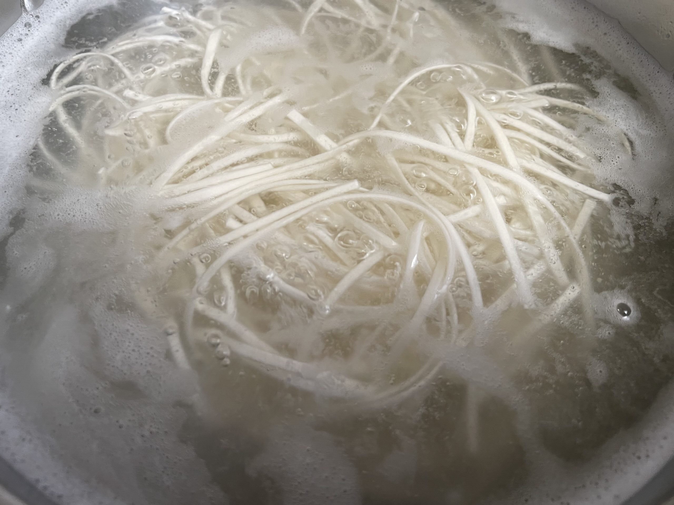 - たっぷりのお湯を沸かし、稲庭うどんを茹でます。茹で上がったらザルにあげて冷水でもみ洗いし、よく水をきったらかけ湯をして麺を温めます。