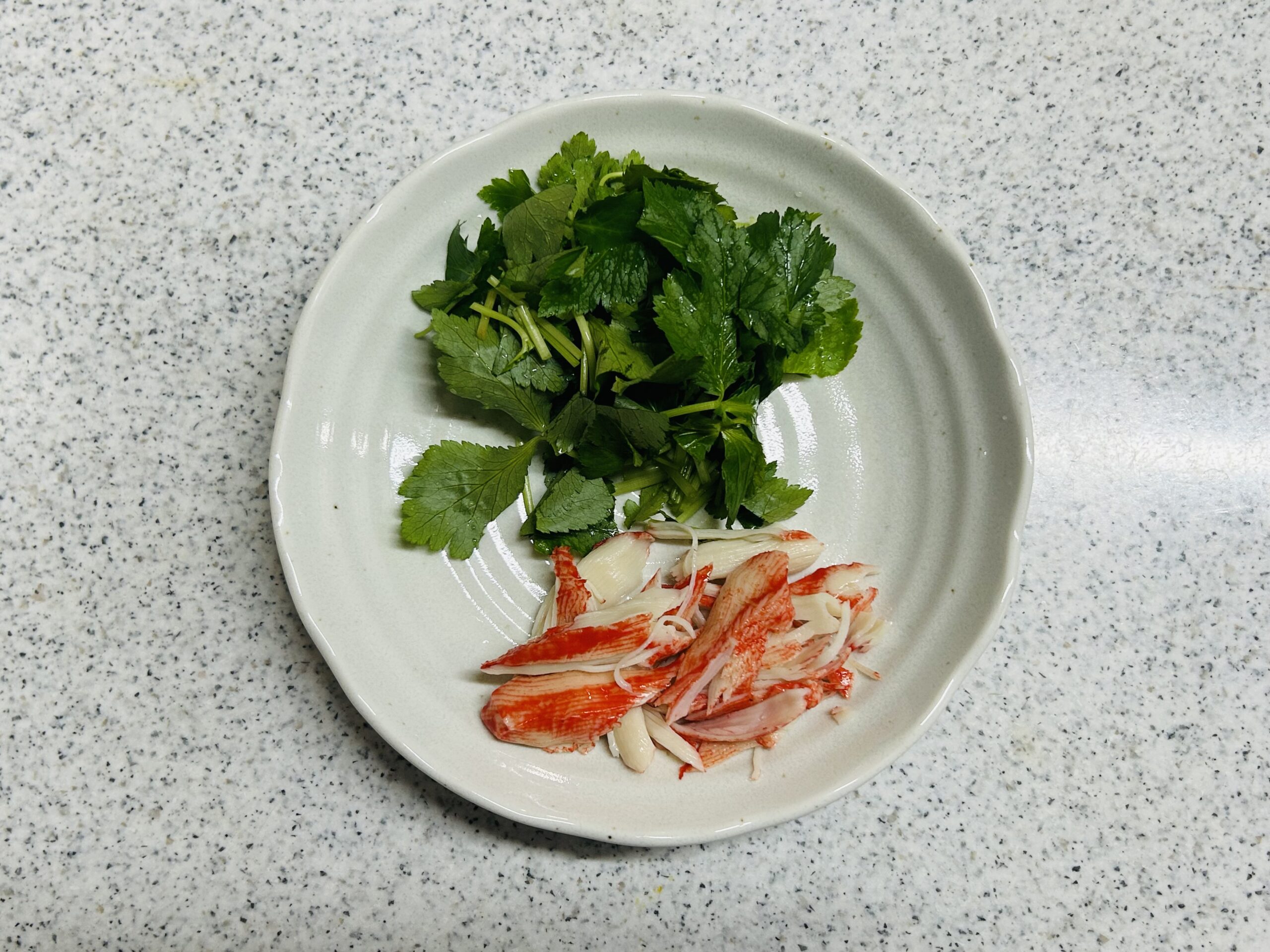 - 三つ葉は食べやすい長さに切ります。カニカマは手で割いておきます。鍋に、だし汁と【めんつゆ】の調味料を全て入れ、ひと煮立ちさせます。