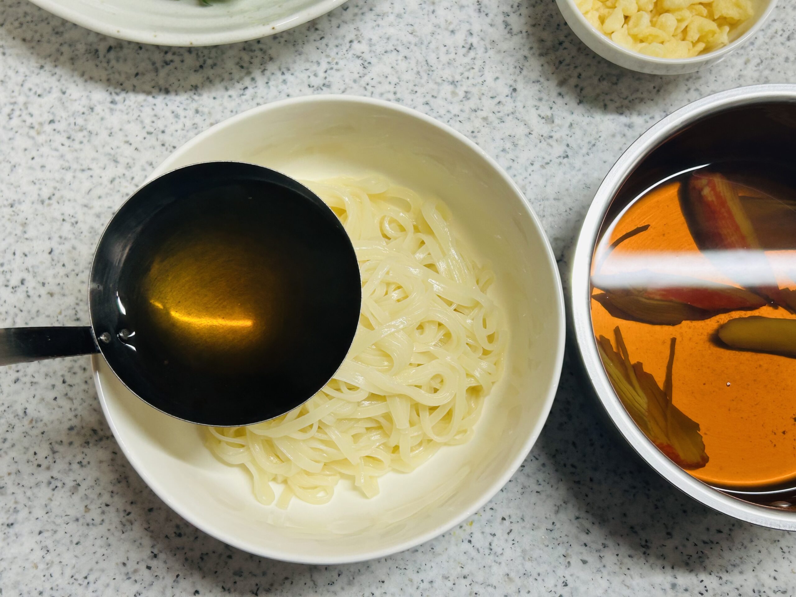 - たっぷりのお湯を沸かし、稲庭うどんを茹でます。茹で上がったらザルにあげて冷水でもみ洗いし、よく水をきったらかけ湯をして麺を温めます。