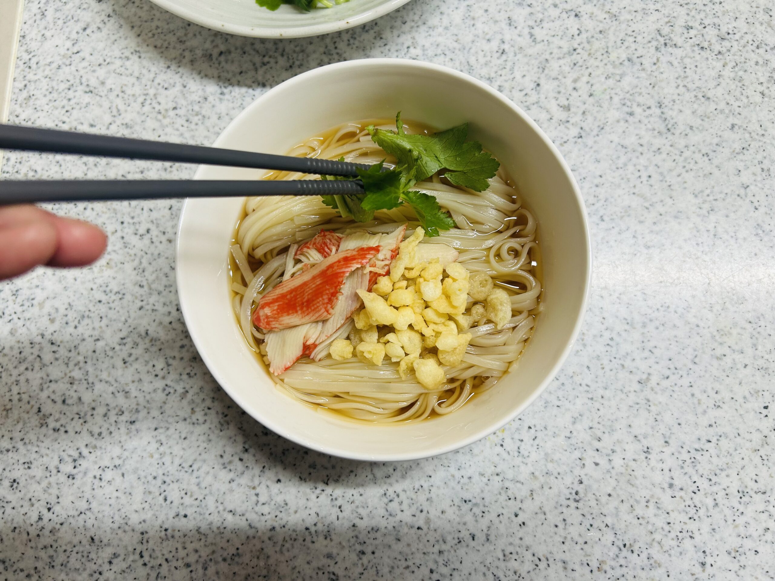 - 盛り付ける直前にカニカマを加え、さっと温め、器に②のうどんと①のつゆを入れて三つ葉・天かすを添えて完成です。
