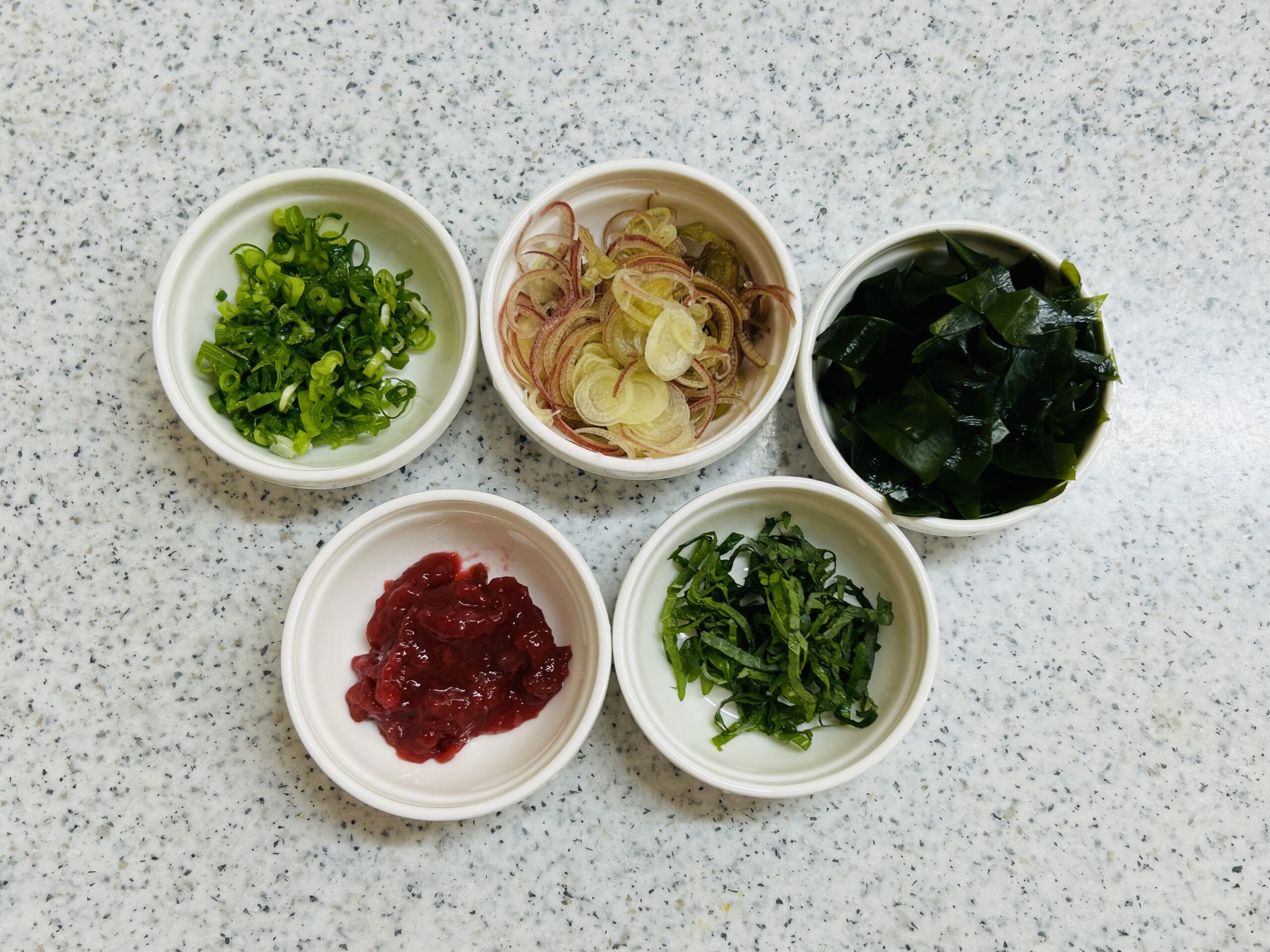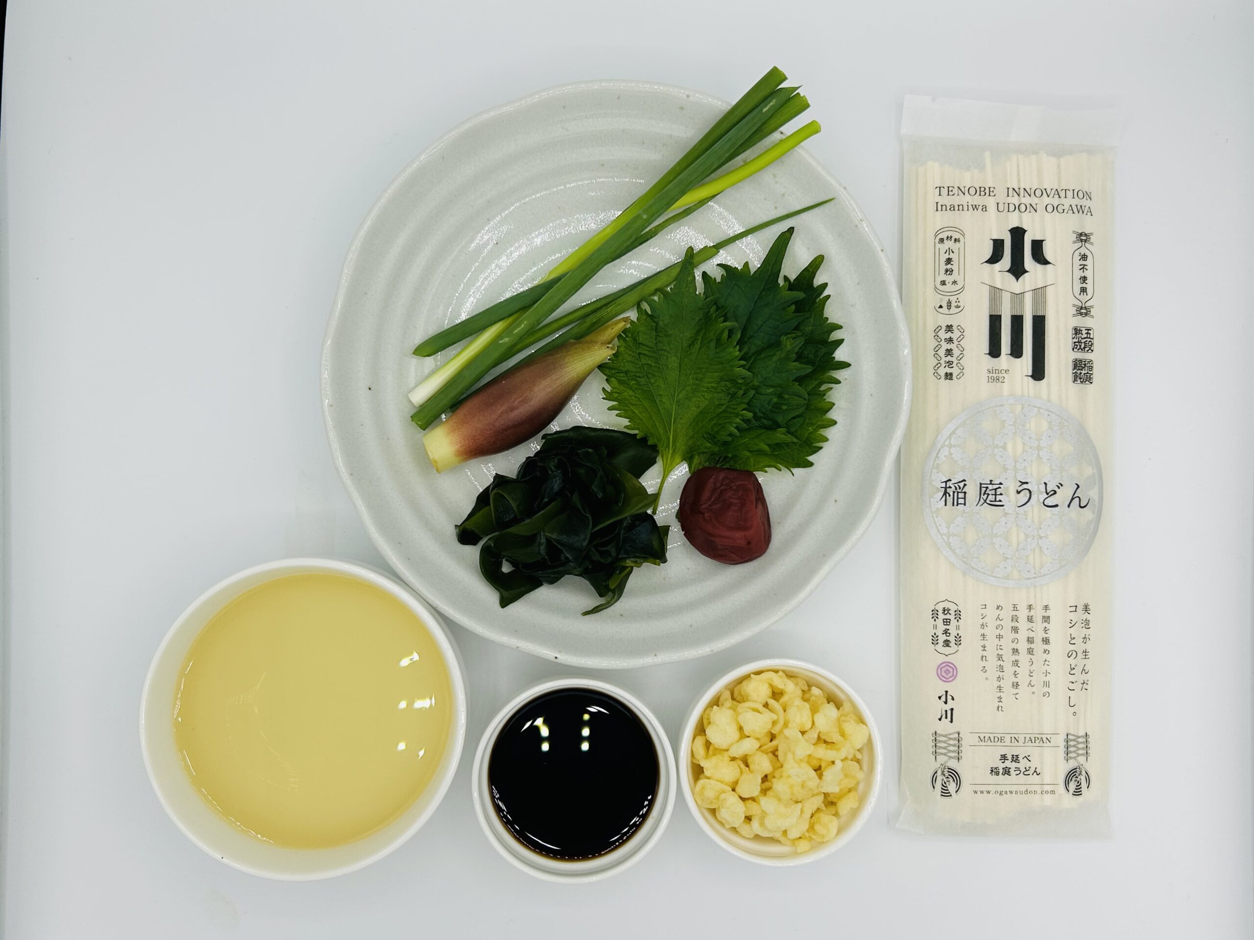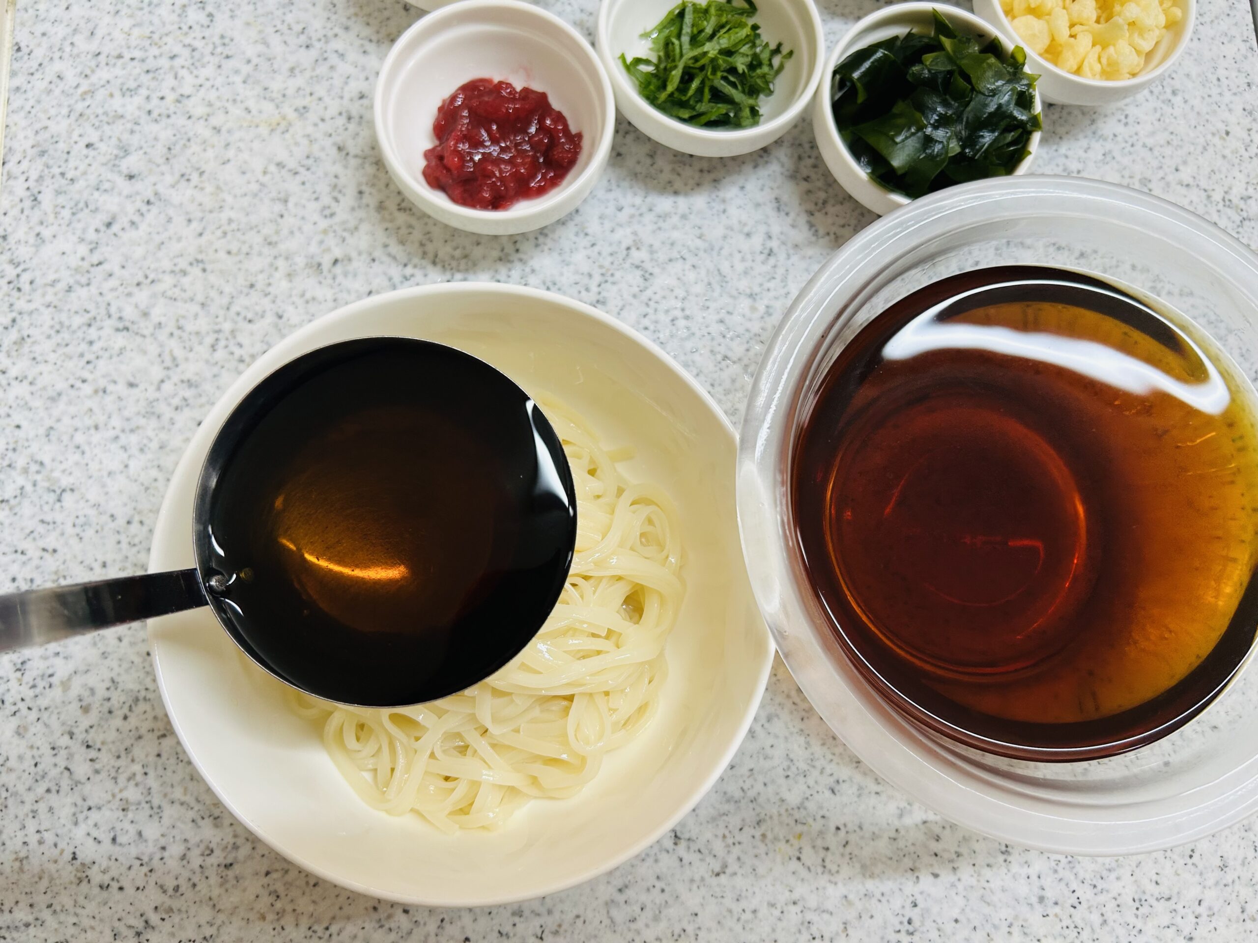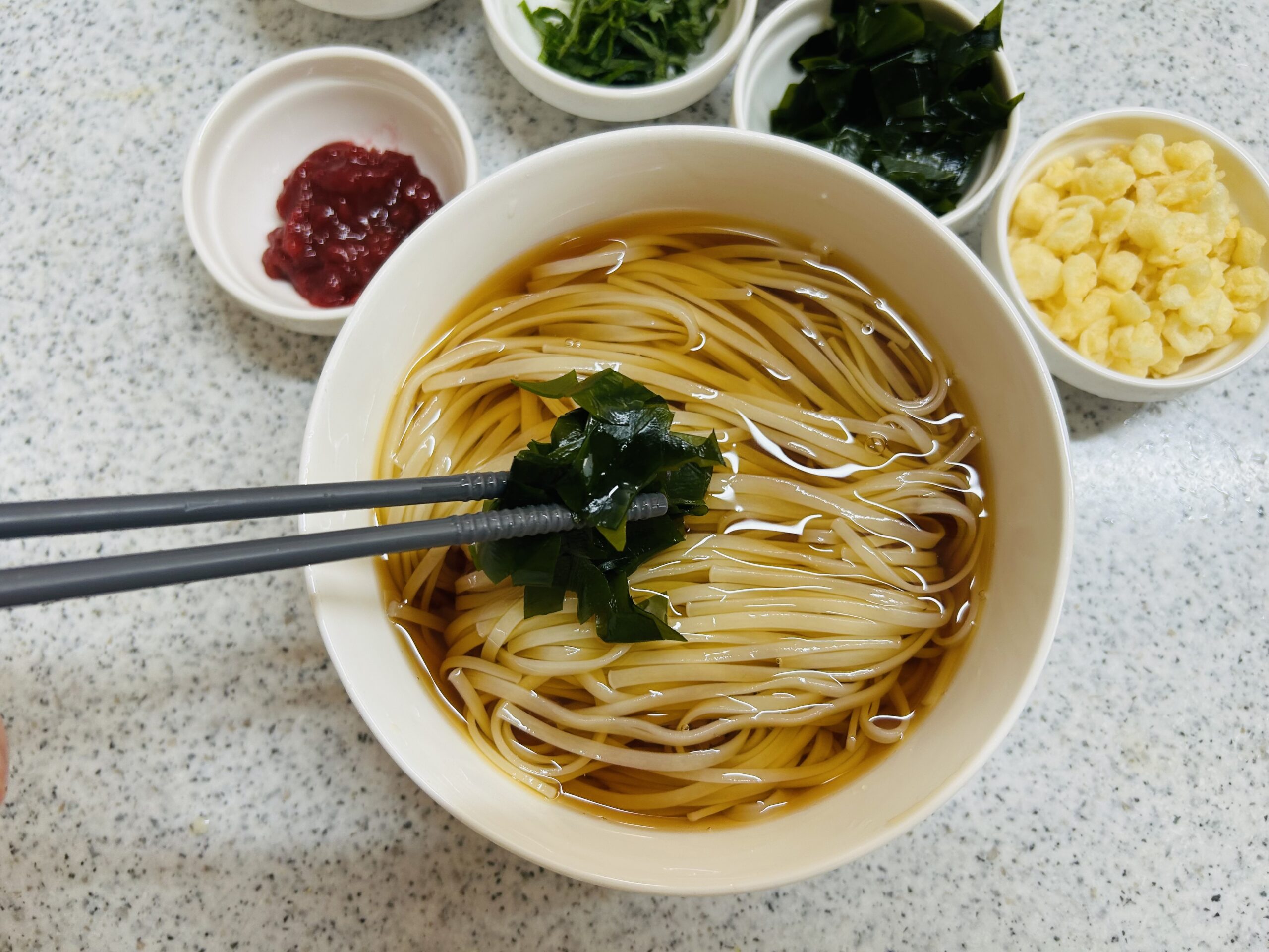 - 器に②のうどんを盛りつけ、梅干し・薬味・天かすを添えて完成です。